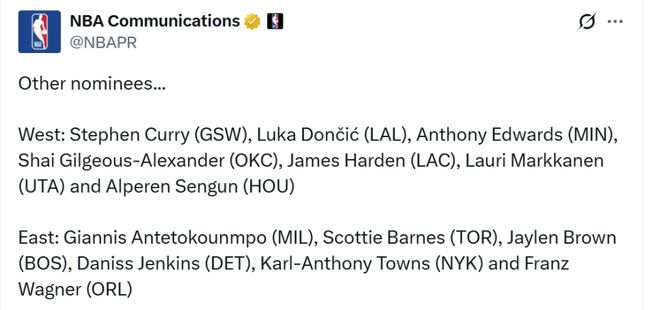 西部:库里(勇士)、东契奇(湖人)、爱德华兹(森林狼)、亚历山大(雷霆)、哈登(快船)、马尔卡宁(爵士)、申京(火箭)