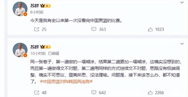 名嘴苏群怒批郭士强固执,不懂得调整和变通,“同一张卷子,第一遍做的一塌糊涂,结果第二遍更加一塌糊涂,这确实没想到的,而且第一遍做得文不对题,第二遍用同样的方式继续文不对题,思路没有极端调整,确实不可思议,匪夷所思,没法理喻”。麦穗丰喷道:世预赛次战延续首战12人名单的做法,更是把“固执”二字体现得淋漓尽致。